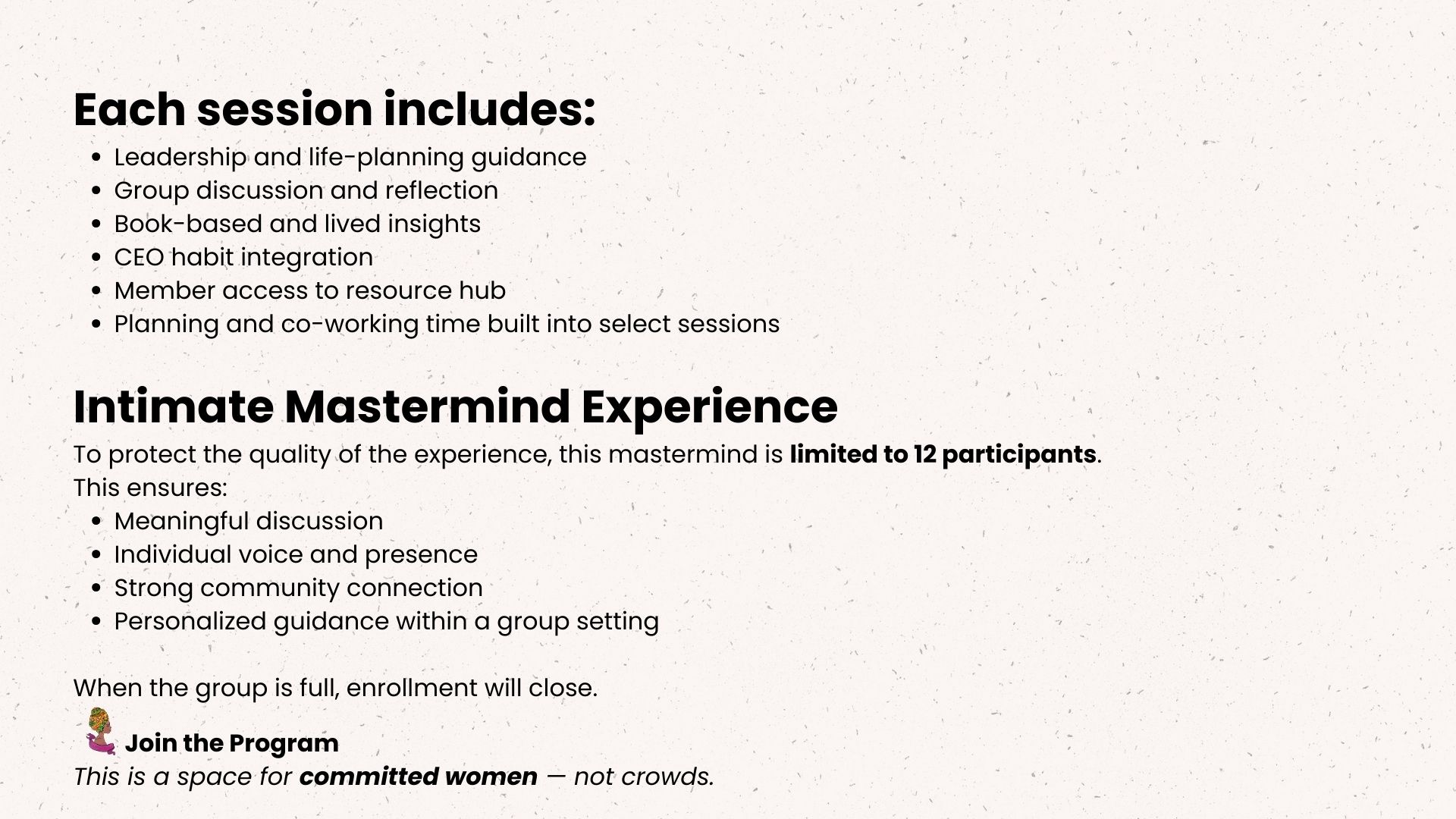 You don’t become someone new — you become who you were meant to be when your life is supported by structure, clarity, and community. As women move through this mastermind, they often notice: