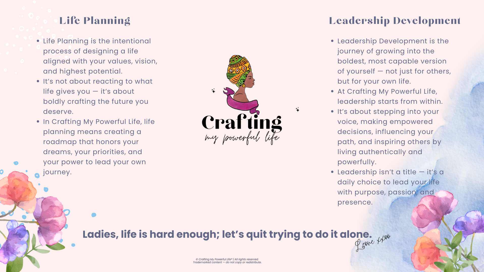 "When women combine life planning with leadership development, transformation happens. Confidence grows. Mindsets shift. And women step into their power as the CEOs of their lives." Leone Williams, Founder of the Crafting My Powerful Life Company & Framework